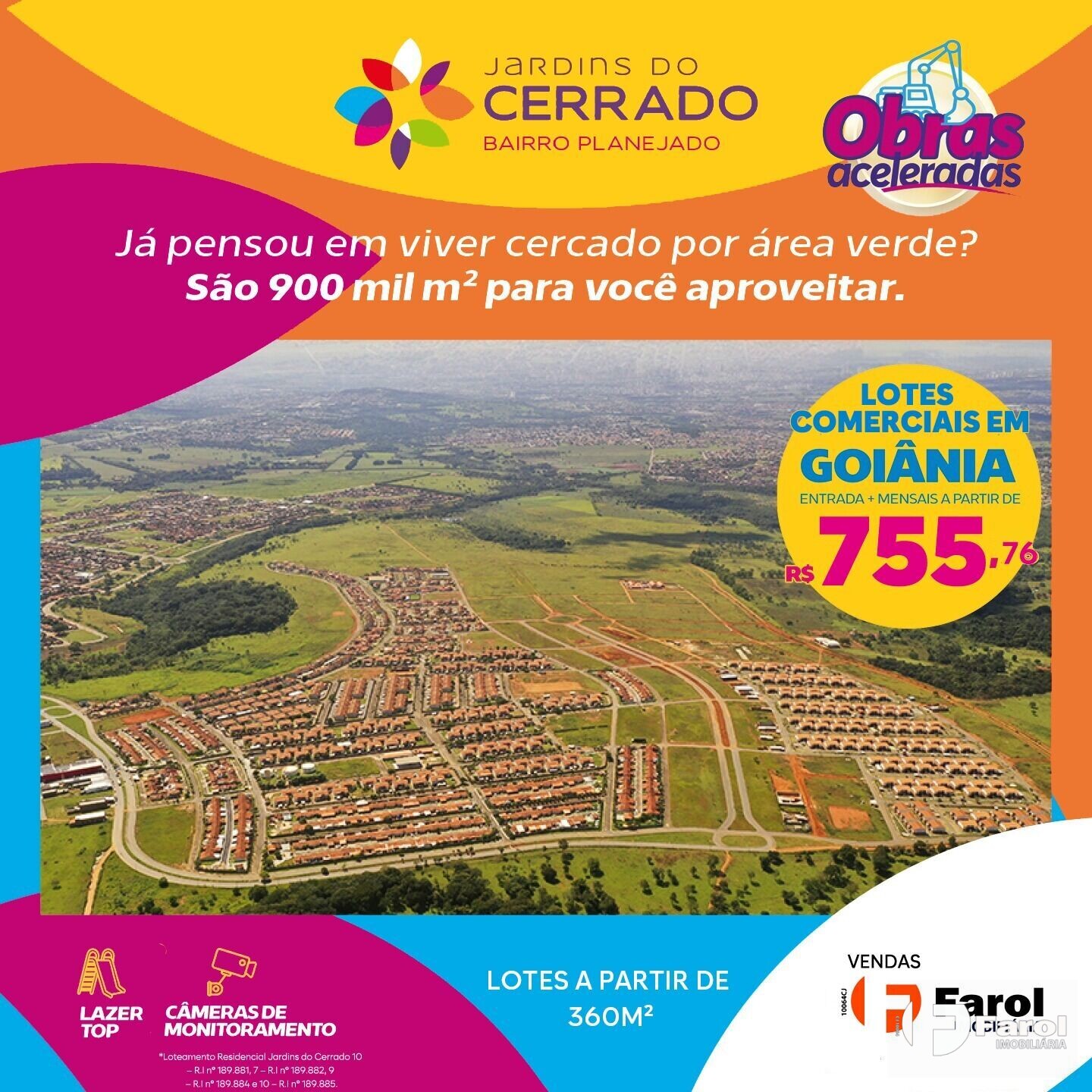 Venha abrir seu negócio no Jardins do Cerrado, um bairro planejado para você comerciante, a 5 minutos da Coca-Cola e próximo ao Conjunto Vera Cruz. O Jardins do Cerrado é um bairro multi: multi lazer com 900 mil m² de muito verde, pista de skate, pista de caminhada e 7 praças com playground para o lazer das crianças; multi segurança com posto policial e câmeras de monitoramento; e multi vantagens como uma região já habitada e com mais de 5 mil potenciais clientes, não estamos de falando de futuro, estamos falando de agora!